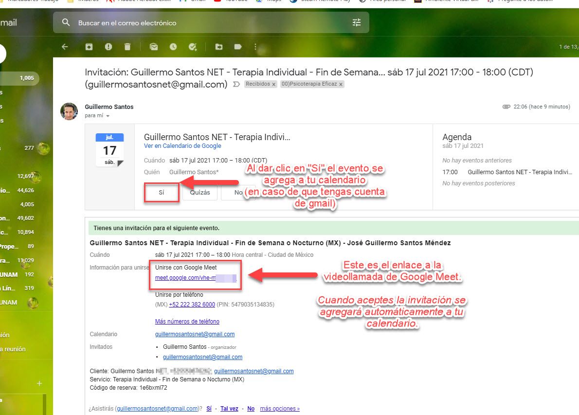 Siempre que programes y pagues una cita recibirás un correo con la invitación de Google Meet a la videollamada.
