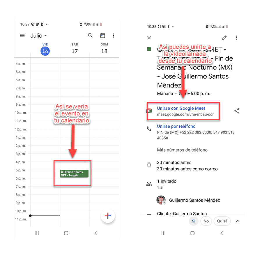 Capturas de pantalla de cómo se vería la cita en tu calendario de Google vía celular.